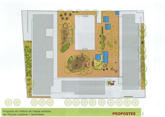 Descripció ampliada: Transformar el pati en un espai d'exploració a partir d'estratègies paisatgístiques inspirades en el paisatge mediterrani, les dunes verdes, el bosc i el desert. La inspiració del bosc es concreta en la creació d'espais refugi, de lectura i amb ombra que promoguin la reflexió i el diàleg. La inspiració del desert es concreta en la creació d'un espai que potenciï la imaginació, l'abstracció i el foment de les relacions interpersonals. La inspiració de dunes verdes es concreta en laberints, amagatalls, desnivells, rampes i jocs amb troncs i neumàtics que faran del lloc un sens fi de possibilitats d'esbarjo, on la psicomotricitat global dels infants millorarà. La inspiració en el paisatge mediterrani es concreta en la plantació de plantes i arbres propis del nostre entorn, oferint a l'alumnat un entorn agradable que proporcioni impulsos i gaudi i on els infants aprenguin a conviure i a compartir espai de joc. Per assolir aquesta transformació s'ha pensat en muntanyes de jocs amb estructures d'equilibri amb troncs, àgores, pedres grans, rotlle de fibra de coco, pou de drenatge, palafit o espai d'amagatall, pentàgon de troncs, arbusts, tub túnel, tarima amb àgora, sorral amb joc simbòlic, taula i seients de troncs, bosc talat i cabanes.